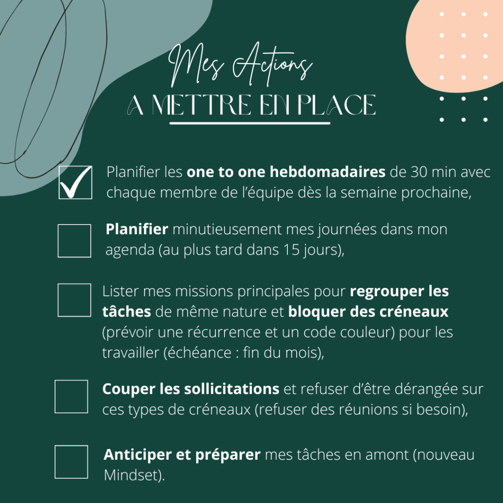 – Je suis hyper chargée… j’ai réussi à caler un point d’équipe par semaine et garder 1 ou 2 créneaux de libre quand mon équipe me sollicite. Sans compter les réunions, les mails à gérer, les problèmes à résoudre… J’aimerais améliorer l’organisation de mon quotidien mais…